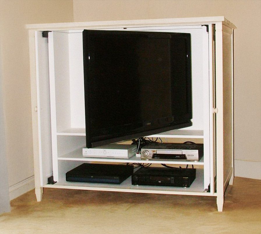 This 42″ TV is on a pivot on an extending arm. The traditional stone Cotswold home restricted the positioning of the large TV into a chimney breast alcove. To achieve wide viewing sightlines the doors slide back into pockets in the cabinet.