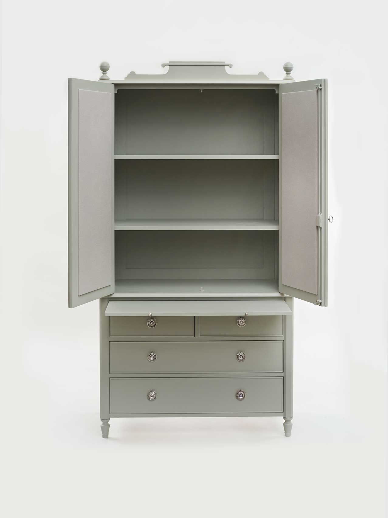 Options: Dome or Scroll Pediment Finials. Pin Boards. Lower Drawers or Cupboard fitted with adjustable shelf Port hole at back for power cables. Painted Wood or Pewter/Brass Ring Handles