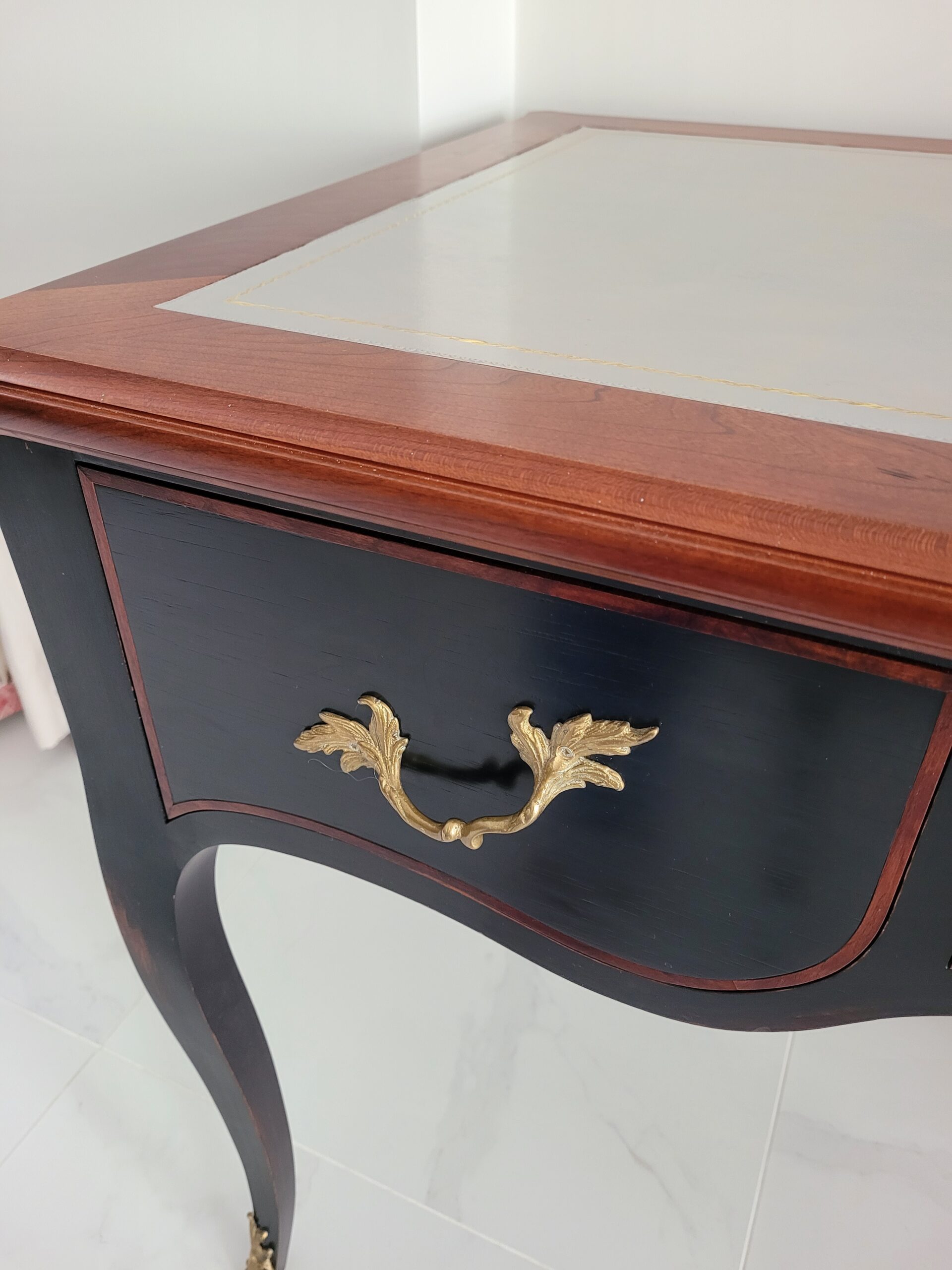 The Elysian Desk writing table design is a fine example of Leporello’s skilled craftsmanship and attention to detail. The desk is a faithful reproduction of traditional French style made in Cherry Wood with a leather top, hand dyed to client’s colour specification and fitted with decorative brassware cast from antique originals – sourced from England.